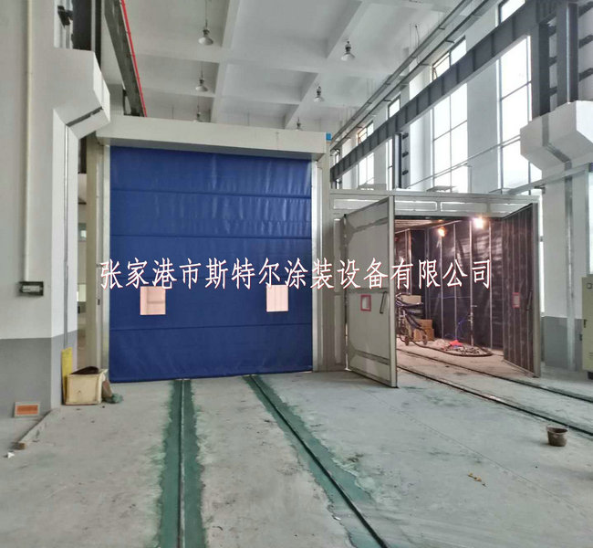 三套涂裝房包括噴砂房,噴漆房,噴鋅房并排置于車間內北側,三套大門平齊朝南,北側與車間之間留有2米距離,用于制作過濾箱和檢修通道。三套房體之間公用兩扇墻體。